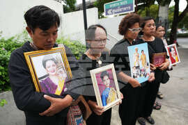Thai people hold portrait of Thailand Queen Mother Sirikit in Bangkok, Thailand, Saturday, Oct. 25, 2025. (AP Photo/Sakchai Lalit)