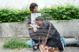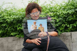 A couple mourning while holding the portrait of Thailand Queen Mother Sirikit in Bangkok, Thailand, Saturday, Oct. 25, 2025. (AP Photo/Sakchai Lalit)