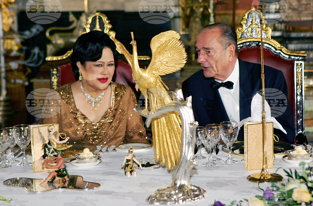 FILE - French President Jacques Chirac, right, speaks with Queen Sirikit of Thailand, at the start of a gala dinner given at the Royal Palace on the first day of his three-day official visit in Bangkok, Thailand, Friday Feb. 17, 2006. (AP Photo/Remy de la Mauviniere, Pool, File)