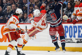 Winnipeg Jets' Neal Pionk (4) defends against Calgary Flames' Mikael Backlund (11) during the first period of an NHL hockey game in Winnipeg, Manitoba, on Friday, Oct. 24, 2025. (John Woods/The Canadian Press via AP)
