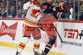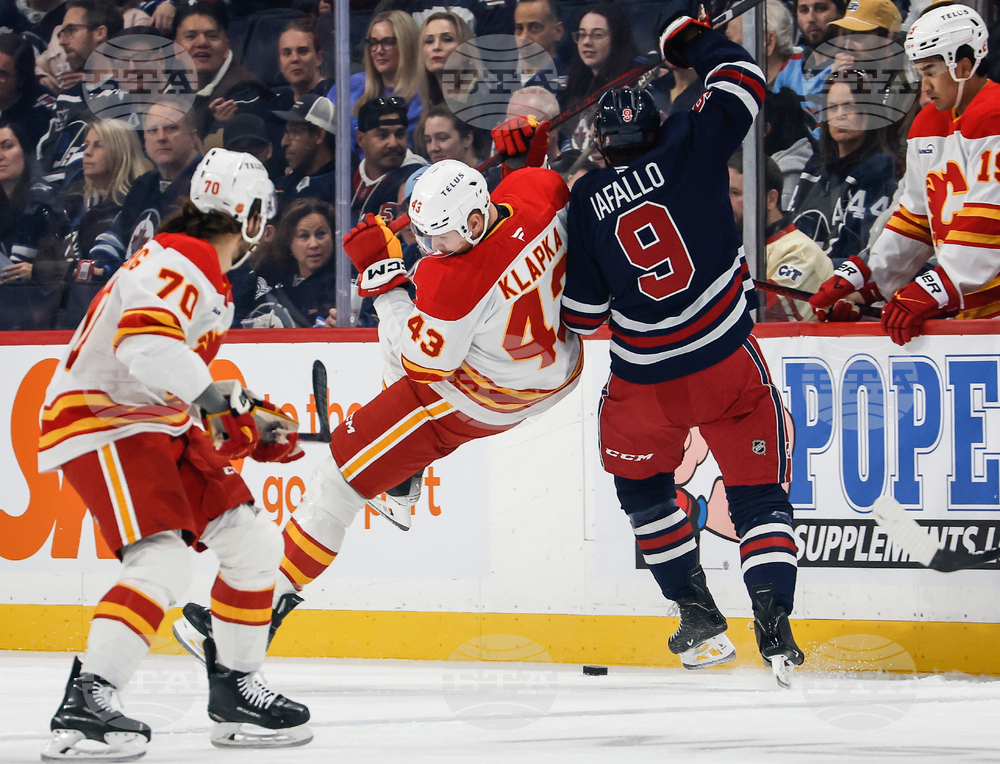 Winnipeg Jets' Alex Iafallo (9) and Calgary Flames' Adam Klapka (43) collide during the first period of an NHL hockey game in Winnipeg, Manitoba, on Friday, Oct. 24, 2025. (John Woods/The Canadian Press via AP)