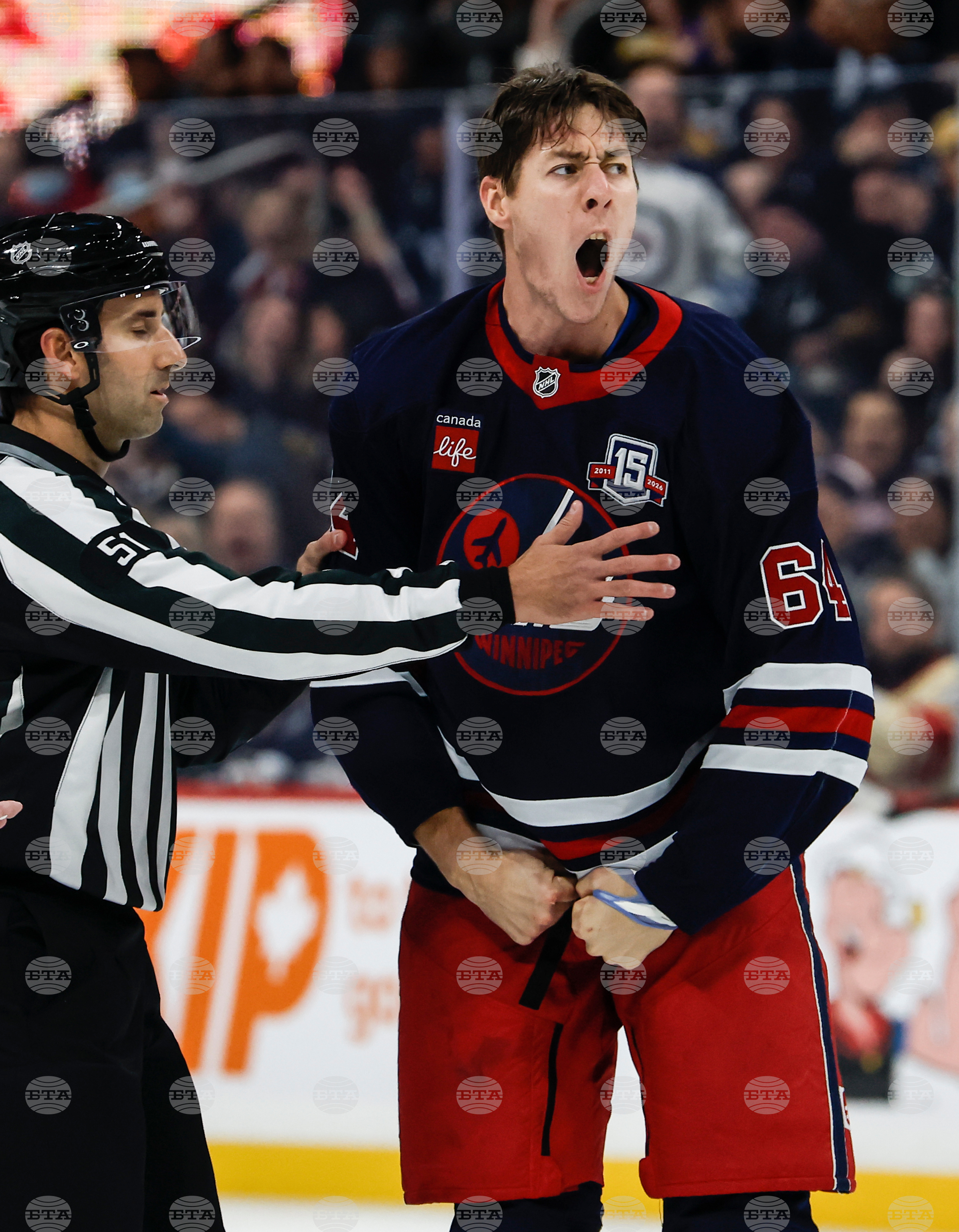 Winnipeg Jets' Logan Stanley (64) reacts after a fight against Calgary Flames' Adam Klapka during first period NHL action in Winnipeg on Friday, Oct. 24, 2025. (John Woods/The Canadian Press via AP)