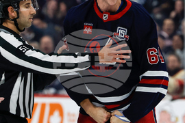 Winnipeg Jets' Mark Scheifele (centre) and Calgary Flames' Connor Zary (left) collide as Joel Farabee (86) picks up the loose puck during first period NHL action in Winnipeg on Friday, Oct. 24, 2025. (John Woods/The Canadian Press via AP)