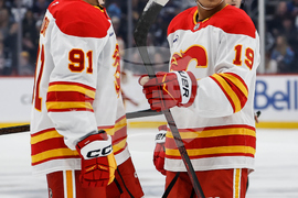 Calgary Flames' Nazem Kadri (91) and Zayne Parekh (19) celebrate Kadri's goal against the Winnipeg Jets during the first period of an NHL hockey game in Winnipeg, Manitoba, on Friday, Oct. 24, 2025. (John Woods/The Canadian Press via AP)