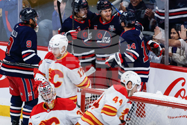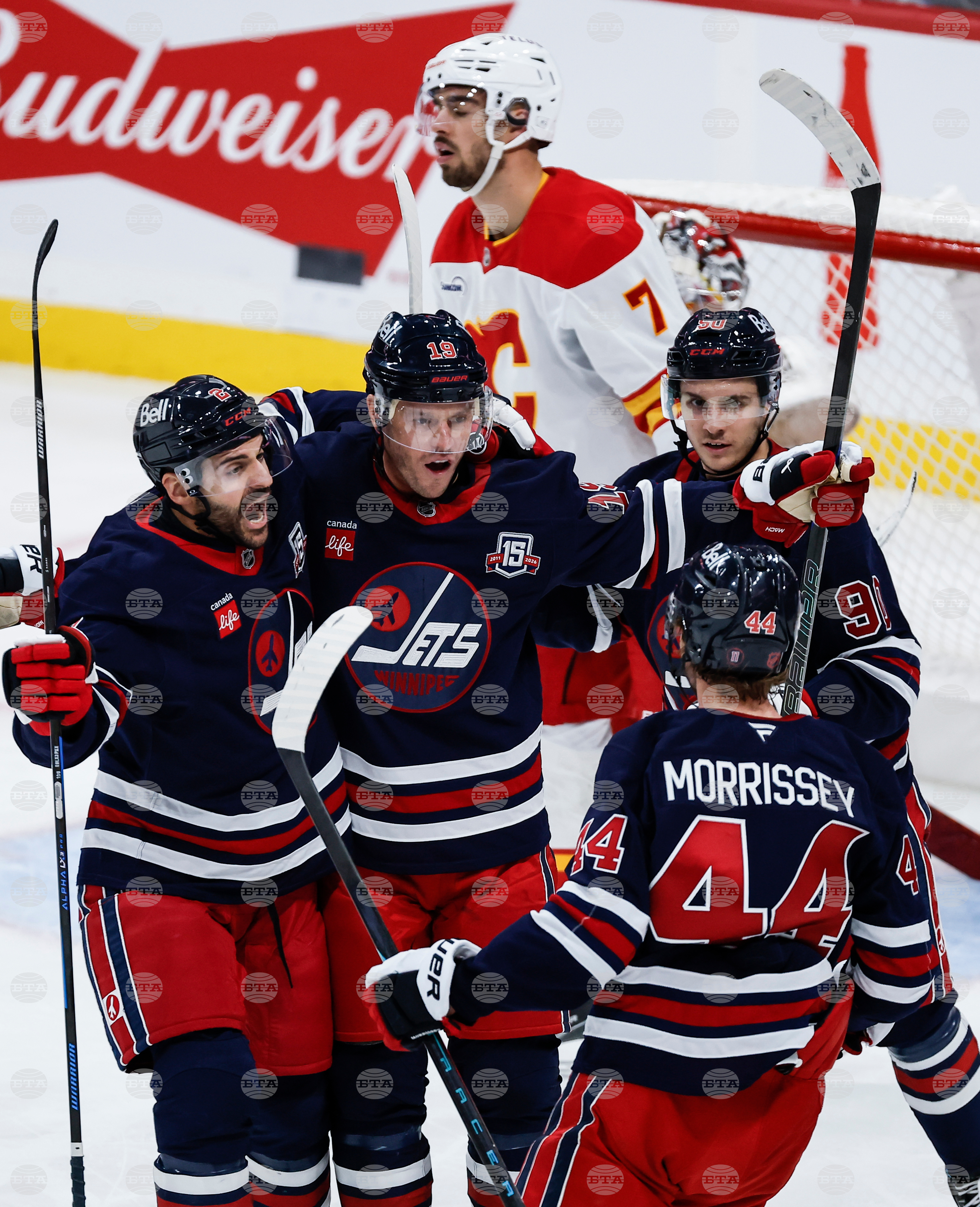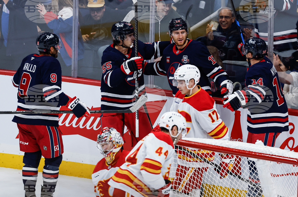 Winnipeg Jets' Alex Iafallo (9), Mark Scheifele (55), Gabriel Vilardi (13) and Gustav Nyquist (14) celebrate after Vilardi's goal against the Calgary Flames during second-period NHL hockey game action in Winnipeg, Manitoba, Friday, Oct. 24, 2025. (John Woods/The Canadian Press via AP)