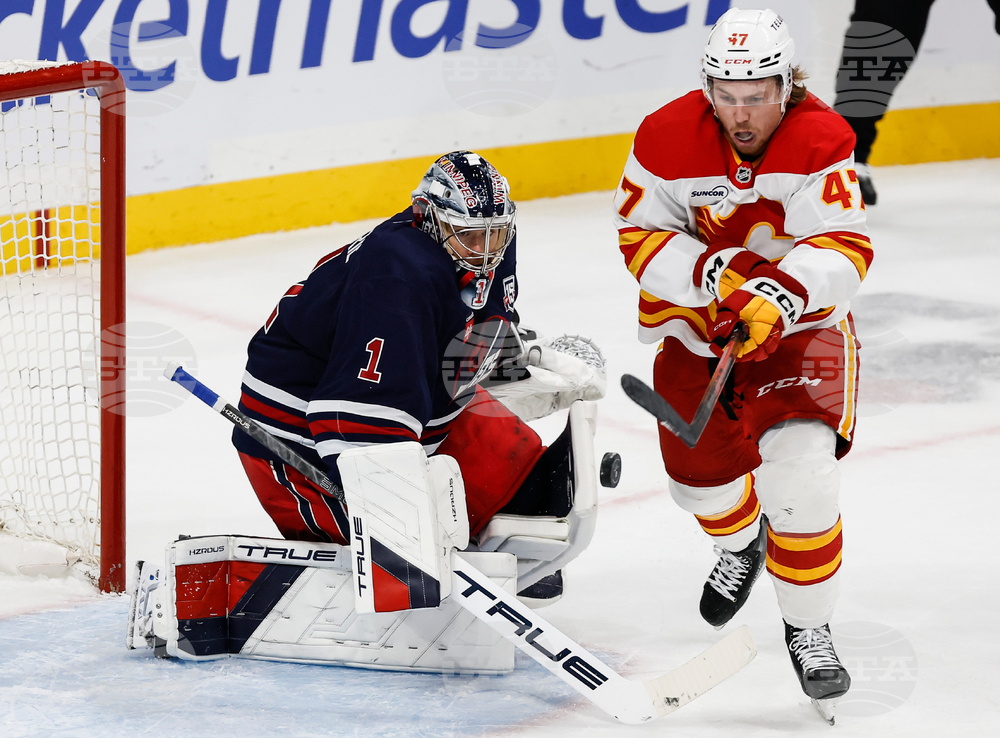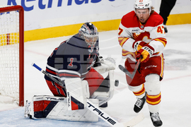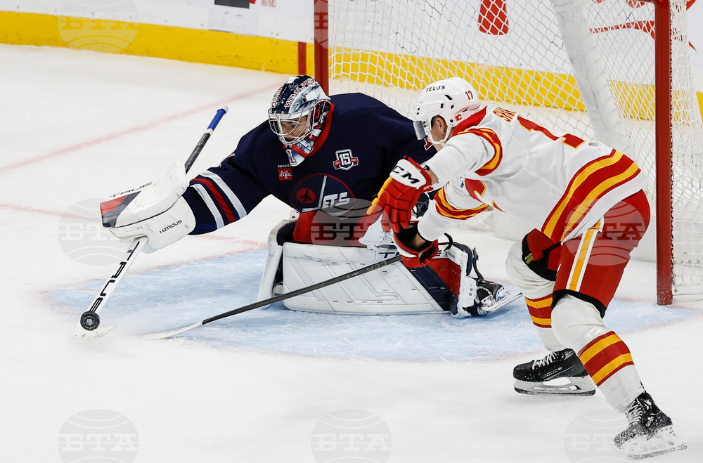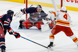 Calgary Flames' Connor Zary (47) knocks down his own rebound off Winnipeg Jets goaltender Eric Comrie (1) during second-period NHL hockey game action in Winnipeg, Manitoba, Friday, Oct. 24, 2025. (John Woods/The Canadian Press via AP)