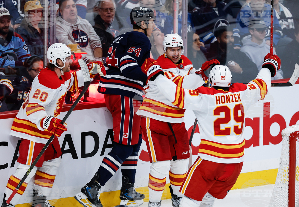 Calgary Flames' Blake Coleman (20), Mikael Backlund (11) and Samuel Honzek (29) celebrate after Backlund's goal against the Winnipeg Jets during second-period NHL hockey game action in Winnipeg, Manitoba, Friday, Oct. 24, 2025. (John Woods/The Canadian Press via AP)
