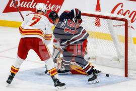 Winnipeg Jets goaltender Eric Comrie, left, pokes the puck away from Calgary Flames' Yegor Sharangovich, right, during third-period NHL hockey game action in Winnipeg, Manitoba, Friday, Oct. 24, 2025. (John Woods/The Canadian Press via AP)