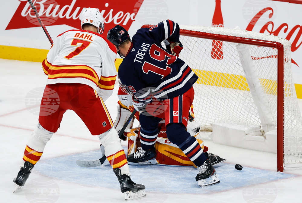 Winnipeg Jets' Jonathan Toews (19) scores against Calgary Flames goaltender Dustin Wolf, back right, as Flames' Kevin Bahl (7) defends during second-period NHL hockey game action in Winnipeg, Manitoba, Friday, Oct. 24, 2025. (John Woods/The Canadian Press via AP)