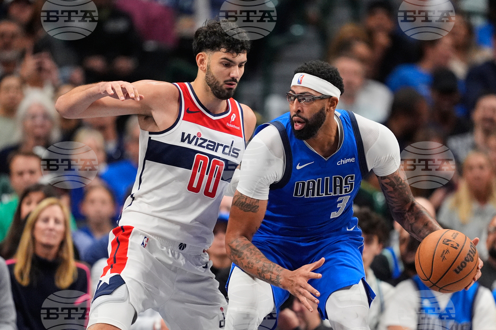 Washington Wizards forward Tristan Vukcevic (00) shoots as Dallas Mavericks' Anthony Davis, right, defends in the first half of an NBA basketball game, Friday, Oct. 24, 2025, in Dallas. (AP Photo/Tony Gutierrez)