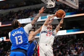 Washington Wizards guard Will Riley (27) takes a hit as he shoots over Dallas Mavericks' Max Christie (00) and Naji Marshall (13) in the first half of an NBA basketball game, Friday, Oct. 24, 2025, in Dallas. (AP Photo/Tony Gutierrez)