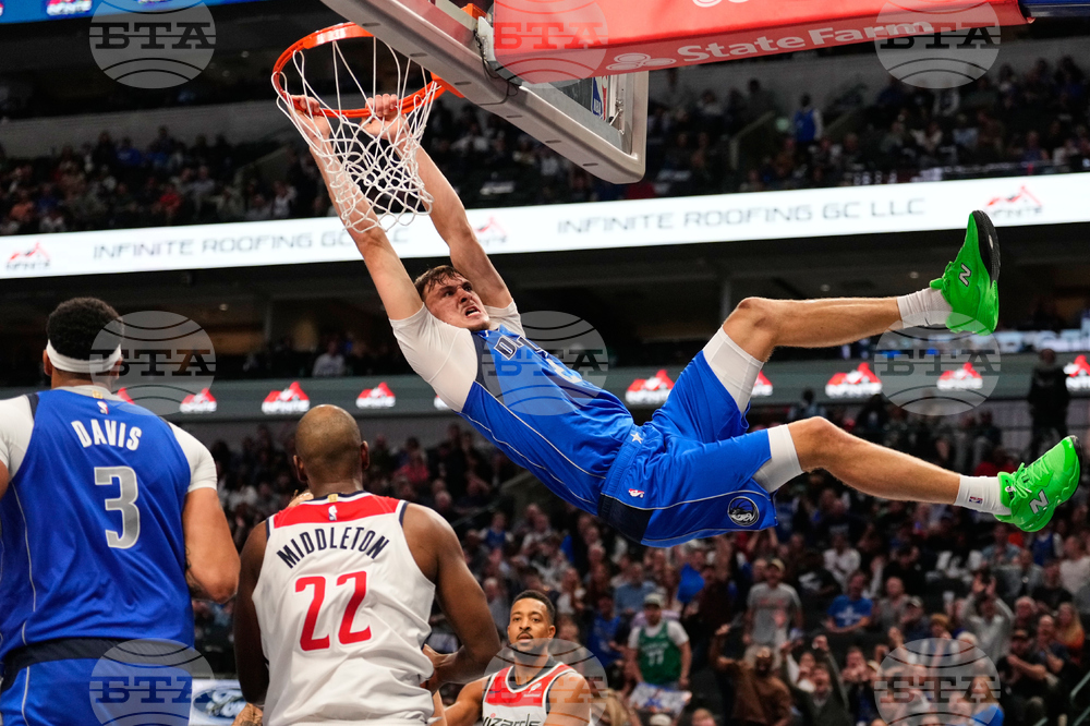 Washington Wizards center Alex Sarr (20) leaps to the basket to dunk between Dallas Mavericks' Anthony Davis, left, and Cooper Flagg (32) in the first half of an NBA basketball game, Friday, Oct. 24, 2025, in Dallas. (AP Photo/Tony Gutierrez)