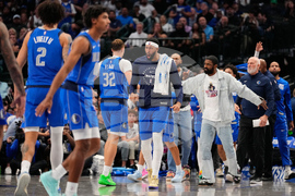 Dallas Mavericks forward Anthony Davis, center right, Cooper Flagg (32), Dereck Lively II (2) and the rest of the team celebrate during a time out in the second half of an NBA basketball game against the Washington Wizards, Friday, Oct. 24, 2025, in Dallas. (AP Photo/Tony Gutierrez)