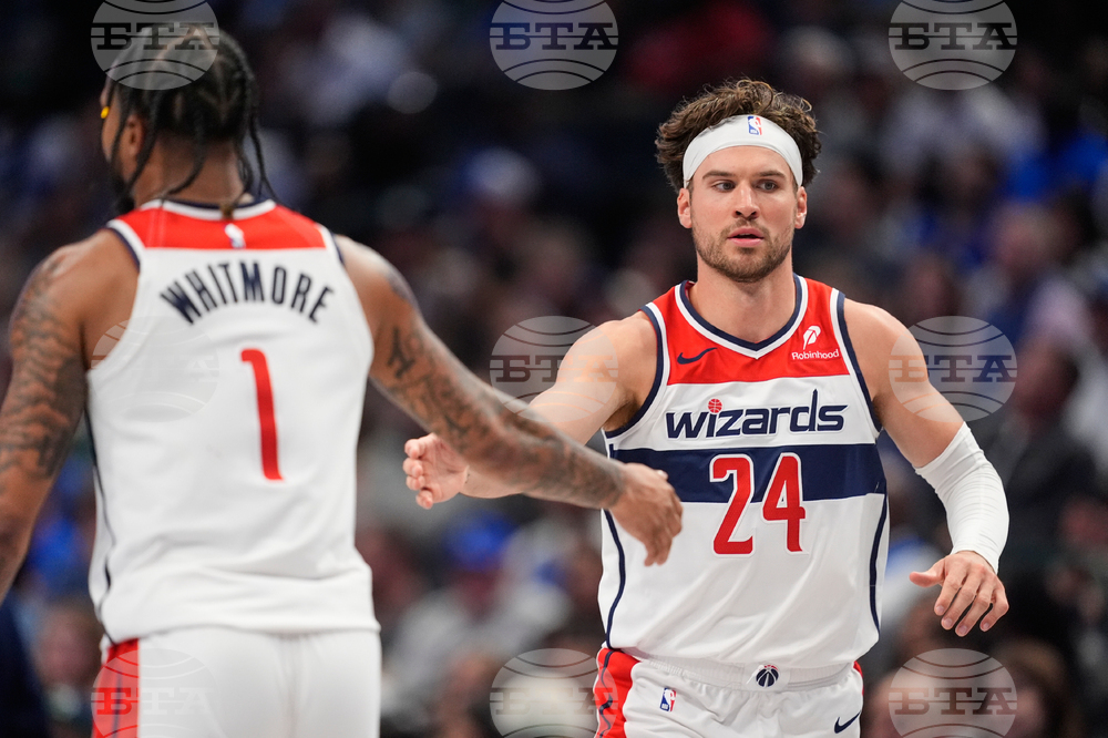 Washington Wizards forward Cam Whitmore (1) and Corey Kispert (24) celebrate a basket made by Kispert in the second half of an NBA basketball game against the Dallas Mavericks, Friday, Oct. 24, 2025, in Dallas. (AP Photo/Tony Gutierrez)