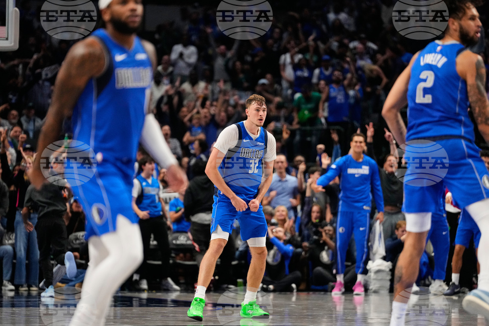 Dallas Mavericks forward Cooper Flagg (32) celebrates after sinking a three-point basket in the second half of an NBA basketball game against the Washington Wizards, Friday, Oct. 24, 2025, in Dallas. (AP Photo/Tony Gutierrez)