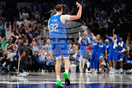 Dallas Mavericks forward Cooper Flagg (32) celebrates after sinking a basket in the second half of an NBA basketball game against the Washington Wizards, Friday, Oct. 24, 2025, in Dallas. (AP Photo/Tony Gutierrez)