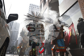 Demonstrators stage a one-day labor stoppage and protest outside of the U.S. Immigration and Customs Enforcement San Francisco Field Office in San Francisco, Calif. Friday, Oct. 24, 2025. (Jessica Christian/San Francisco Chronicle via AP)