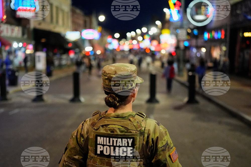 Members of the National Guard stand watch at the intersection of B.B. King Blvd. and Beale Street, Friday, Oct. 24, 2025, in Memphis, Tenn. (AP Photo/George Walker IV)