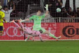 Nashville SC midfielder Gastón Brugman, right, looks up at the scoreboard at the end of the second half of match one of an MLS playoff opening round soccer match against the Inter Miami, Friday, Oct. 24, 2025, in Fort Lauderdale, Fla. (AP Photo/Marta Lavandier)