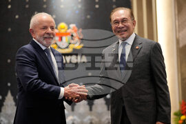 Brazilian President Luiz Inácio Lula da Silva, left, is greeted by Malaysian Prime Minister Anwar Ibrahim in Putrajaya, Malaysia, Saturday, Oct. 25, 2025. (AP Photo/Vincent Thian, Pool)