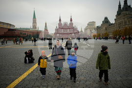 FILE - A family walks through Red Square in Moscow, Russia, Sunday, Aug. 4, 2024. (AP Photo/Alexander Zemlianichenko, File)