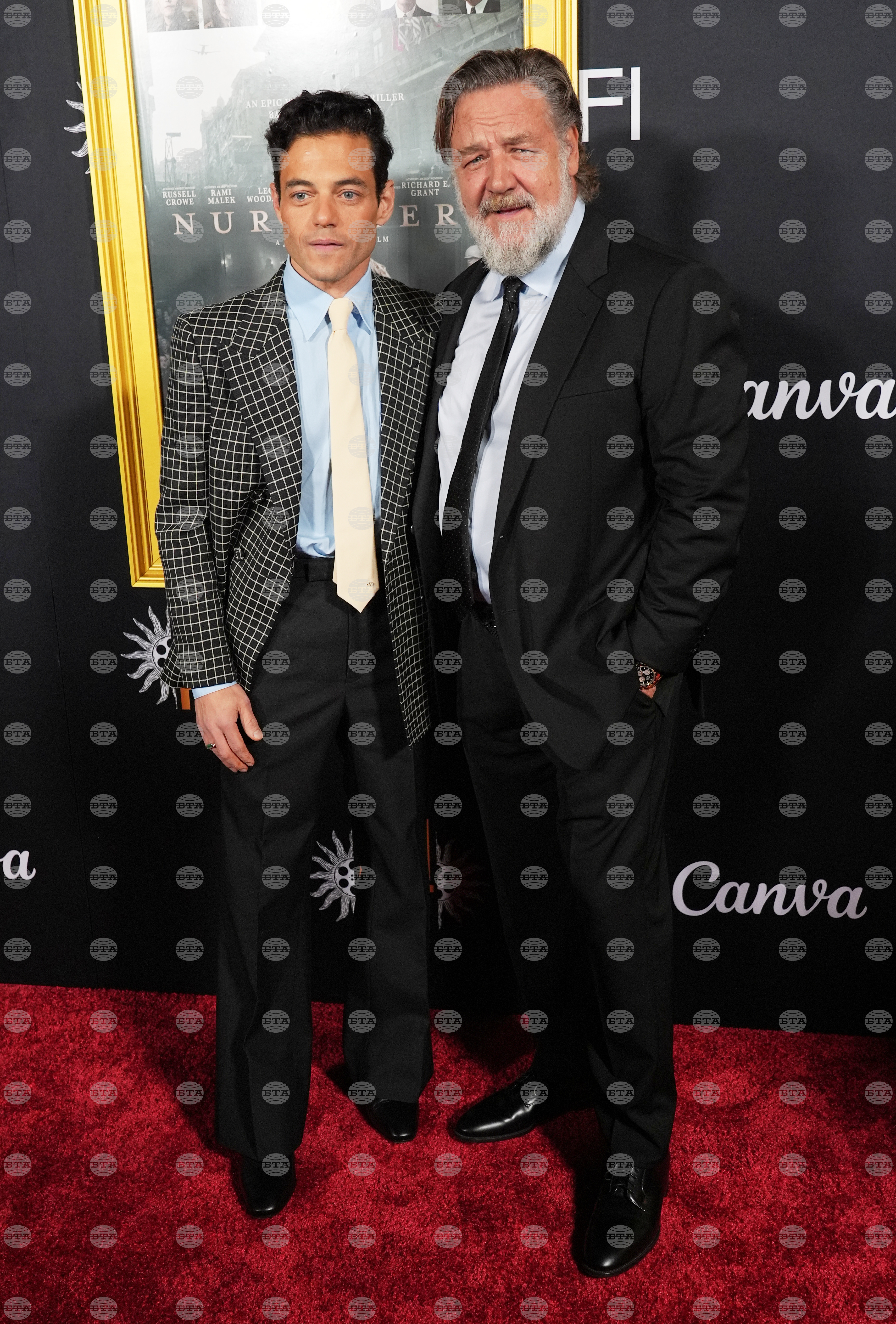 Rami Malek, left, and Russell Crowe, cast members in "Nuremberg," pose together at the AFI Fest premiere of the film on Friday, Oct. 24, 2025, at TCL Chinese Theatre in Los Angeles. (AP Photo/Chris Pizzello)