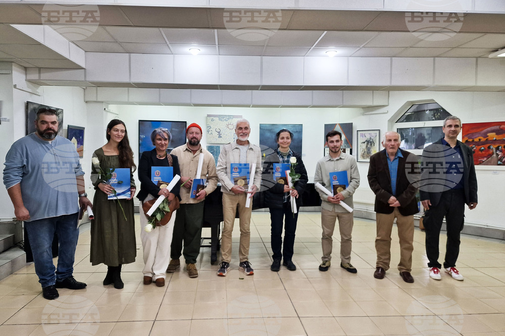 Монтана (25 октомври 2025) Снощи в Художествената галерия „Кирил Петров“ - Монтана бяха наградени финалистите в Националната изложба биенале „Тенец“. Отличията на името на Йордан Радичков бяха връчени при откриването на изложбата с творбите от конкурса в галерията. На снимката ( от ляво надясно): Петър Григоров с 1-во място в раздел „Приложни изкуства“, Мая Трайчева номинирана в раздел „Млад автор“, Екатерина Деянова получила наградата на СБХ, Зоран Мише 1-во място в раздел „Графика“, Николай Тодоров с 1-во място в раздел „Живопис“, Славина Русева-Стефанова спечелила голямата награда на името на Йордан Радичков, Симеон Лазаров с 1-во място в раздел „Млад автор“, художникът Теодоси Антонов и Николай Маринов с 1-во място в раздел „Скулпутра“.