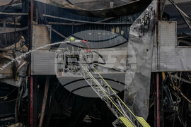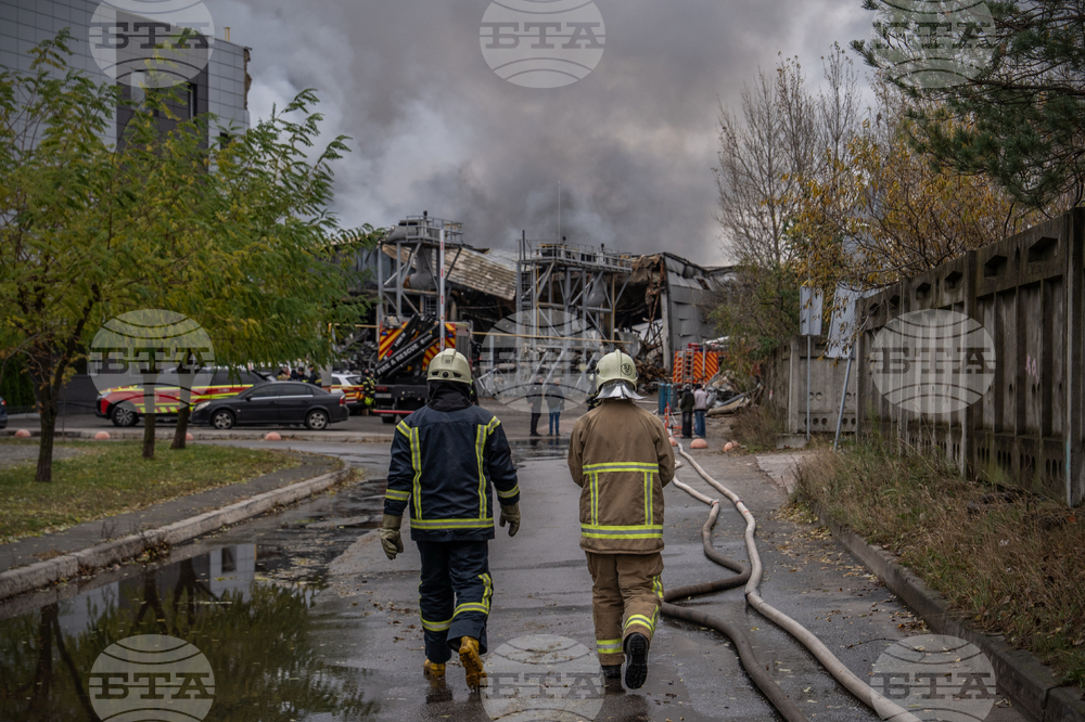 Firefighters walk towards a warehouse that caught fire following a Russian attack, Saturday, Oct. 25, 2025, in Kyiv, Ukraine. (AP Photo/Julia Demaree Nikhinson)