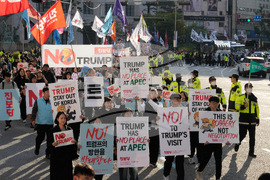 Protesters attend a rally against U.S. President Donald Trump's tariffs policy on South Korea, in Seoul, South Korea, Saturday, Oct. 25, 2025. (AP Photo/Ahn Young-joon)