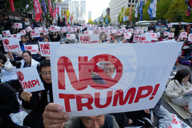 People attend a rally against U.S. President Donald Trump's tariffs policy on South Korea, in Seoul, South Korea, Saturday, Oct. 25, 2025. (AP Photo/Ahn Young-joon)