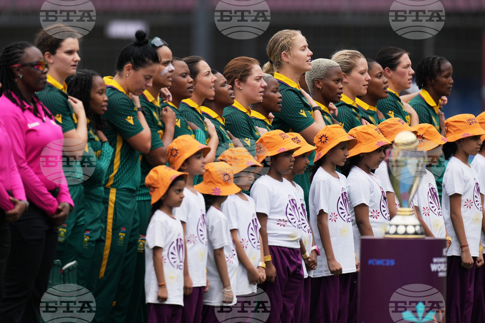 South Africa's players stands for national anthem during the ICC Women's Cricket World Cup match between Australia and South Africa in Indore, India, Saturday, Oct. 25, 2025. (AP Photo/Ajit Solanki)