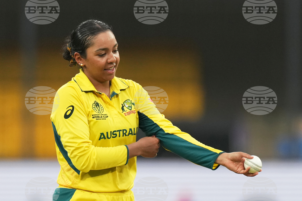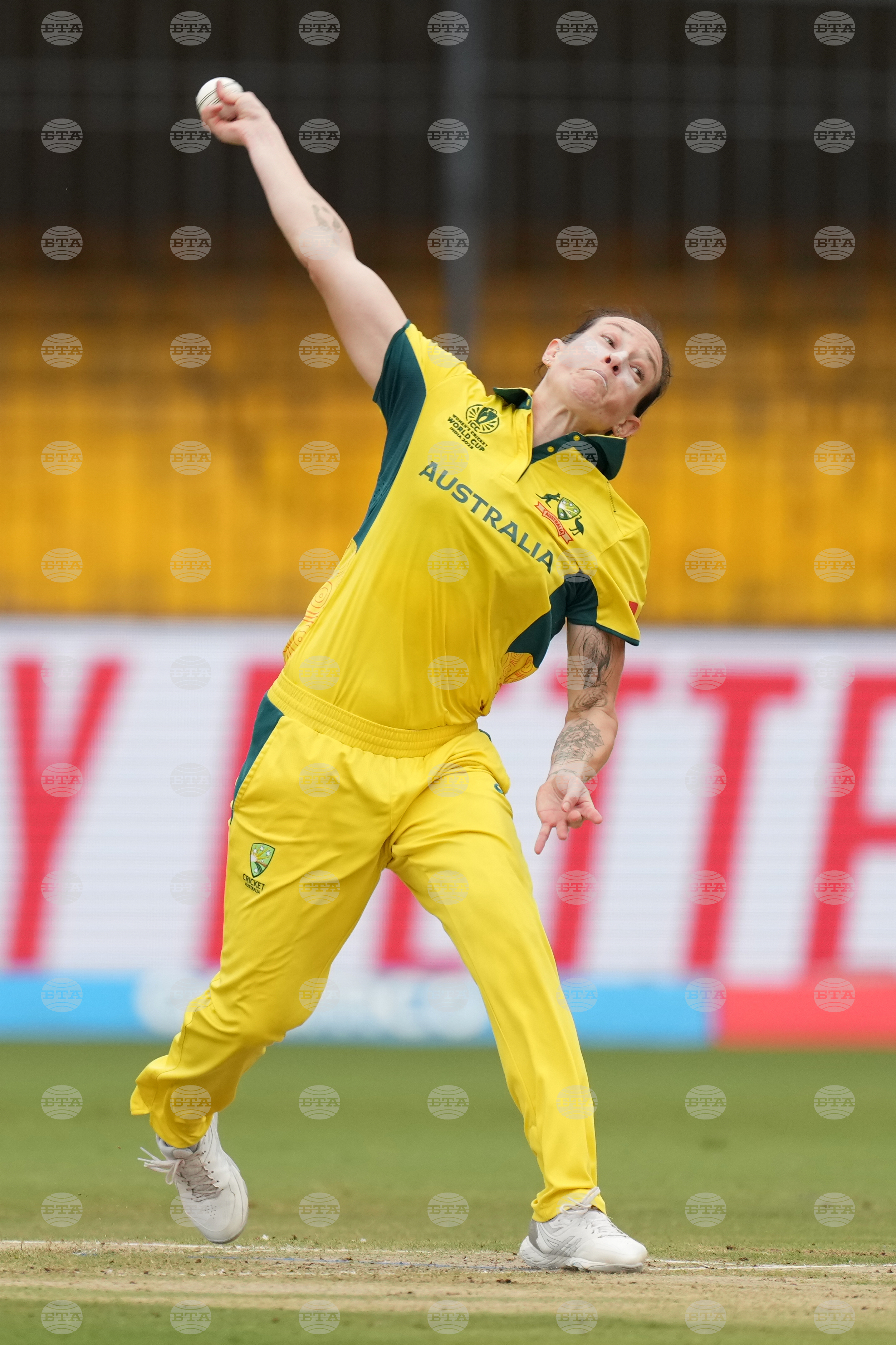 Australia's Megan Schutt bowls a delivery during the ICC Women's Cricket World Cup match between Australia and South Africa in Indore, India, Saturday, Oct. 25, 2025. (AP Photo/Ajit Solanki)