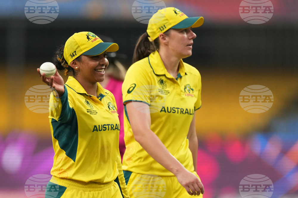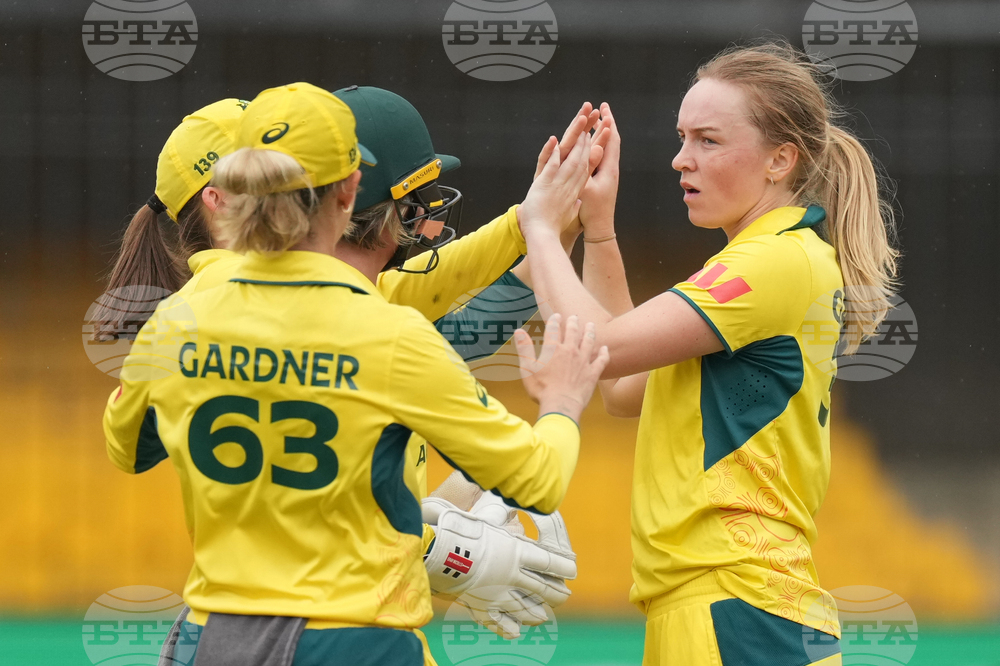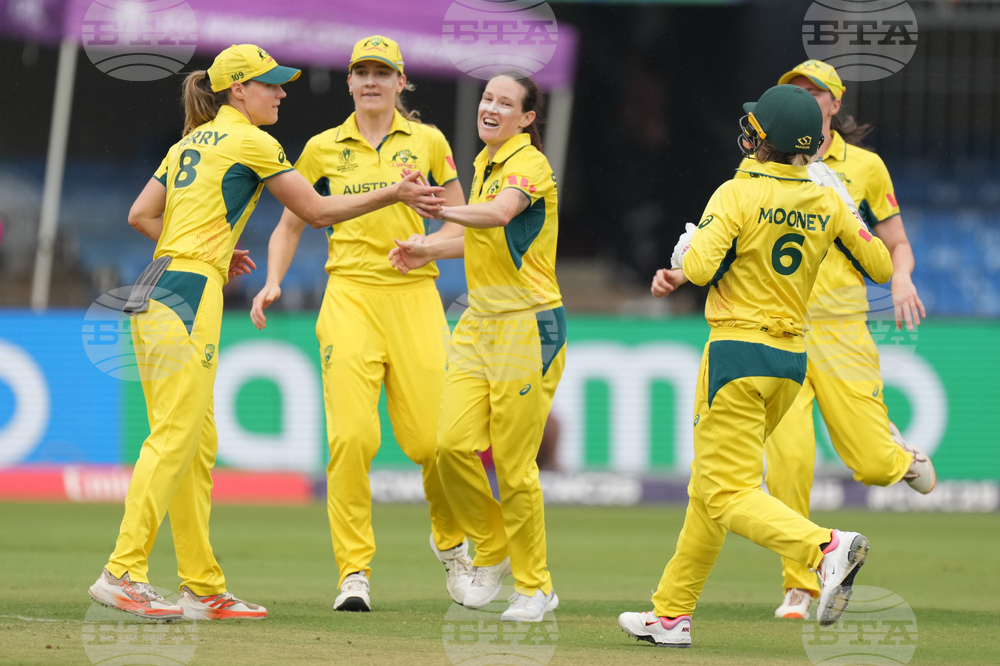 Australia's Kim Garth, right, celebrates with teammate the wicket of South Africa's Tazmin Brits during the ICC Women's Cricket World Cup match between Australia and South Africa in Indore, India, Saturday, Oct. 25, 2025. (AP Photo/Ajit Solanki)