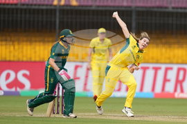South Africa's Masabata Klaas appeals unsuccessfully for the wicket of Australia's Georgia Voll during the ICC Women's Cricket World Cup match between Australia and South Africa in Indore, India, Saturday, Oct. 25, 2025. (AP Photo/Ajit Solanki)