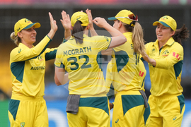 Australia's Kim Garth, center, celebrates with teammate the wicket of South Africa's Tazmin Brits during the ICC Women's Cricket World Cup match between Australia and South Africa in Indore, India, Saturday, Oct. 25, 2025. (AP Photo/Ajit Solanki)