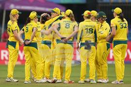 Australia's players stands for national anthem during the ICC Women's Cricket World Cup match between Australia and South Africa in Indore, India, Saturday, Oct. 25, 2025. (AP Photo/Ajit Solanki)
