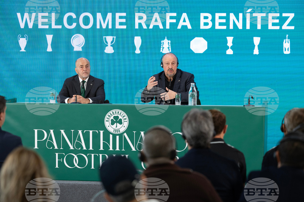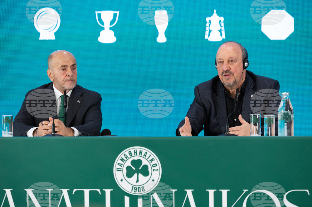 President of Panathinaikos F.C. Giannis Alafouzos, left, addresses journalists as he presents Rafa Benitez as new head coach of Panathinaikos, in Athens, Greece, on Saturday, Oct. 25, 2025. (AP Photo/Yorgos Karahalis)