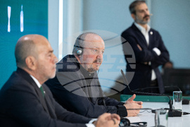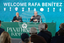 Rafa Benitez, new head coach of Panathinaikos, center, listens to journalists' questions during his presentation by the President of Panathinaikos F.C. Giannis Alafouzos, in Athens, Greece, on Saturday, Oct. 25, 2025. (AP Photo/Yorgos Karahalis)