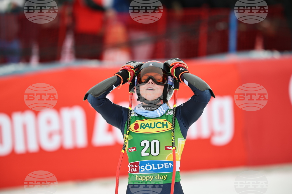 United States' Mikaela Shiffrin reacts at the finish area of an alpine ski, women's World Cup giant slalom, in Soelden, Austria, Saturday, Oct. 25, 2025. (AP Photo/Marco Trovati)
