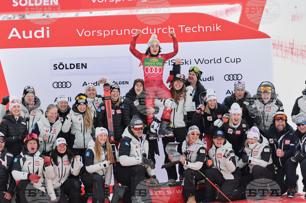 Austria's Julia Scheib, winner of an alpine ski, women's World Cup giant slalom, celebrates with the team, in Soelden, Austria, Saturday, Oct. 25, 2025. (AP Photo/Marco Trovati)