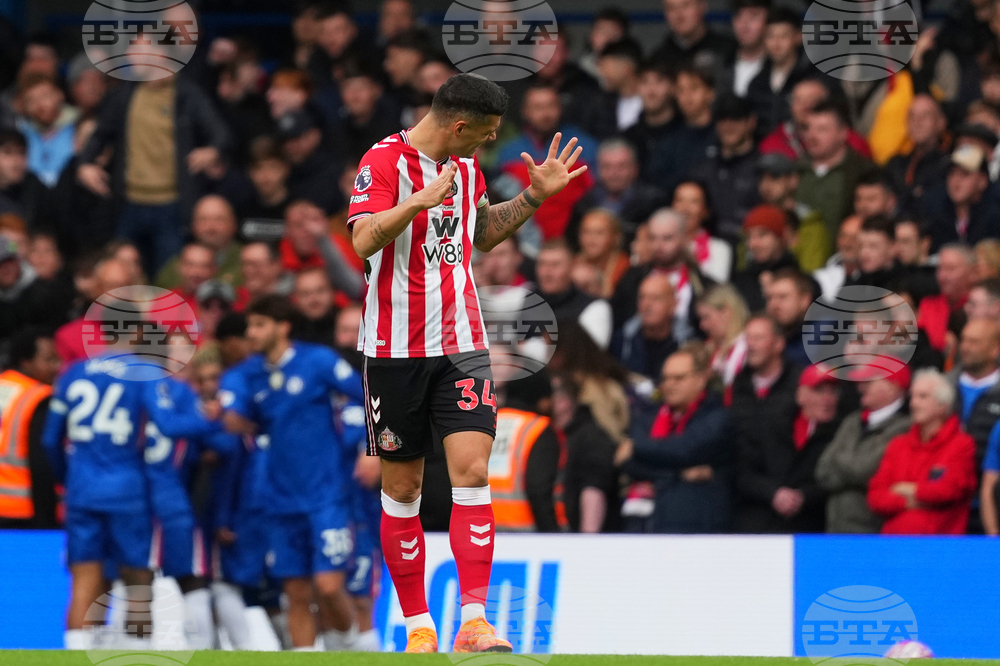 Sunderland's Wilson Isidor celebrates, left, after scoring his side's first goal during the English Premier League soccer match between Chelsea and Sunderland in London, Saturday, Oct. 25, 2025. (AP Photo/Joanna Chan)