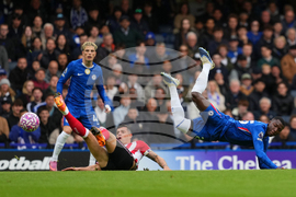 Sunderland's Daniel Ballard takes a shot next to Chelsea's Tyrique George, left, during the English Premier League soccer match between Chelsea and Sunderland in London, Saturday, Oct. 25, 2025. (AP Photo/Joanna Chan)