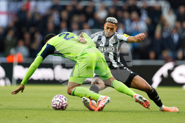 Newcastle United's Harvey Barnes, left, and Fulham's Calvin Bassey in action during the English Premier League soccer match between Newcastle United and Fulham at St James' Park, Newcastle-upon-Tyne, England, Saturday Oct. 25, 2025. (Richard Sellers/PA via AP)
