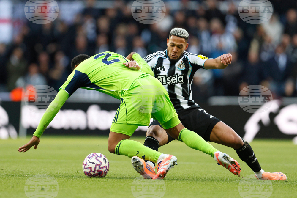 Fulham's Kenny Tete, left, and Newcastle United's Joelinton battle for the ball during the English Premier League soccer match between Newcastle United and Fulham at St James' Park, Newcastle-upon-Tyne, England, Saturday Oct. 25, 2025. (Richard Sellers/PA via AP)