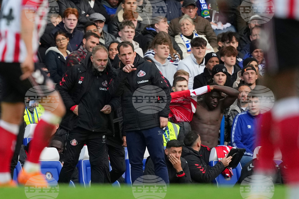 Sunderland's head coach Regis Le Bris speaks to assistant coach Michael Proctor, left, during the English Premier League soccer match between Chelsea and Sunderland in London, Saturday, Oct. 25, 2025. (AP Photo/Joanna Chan)