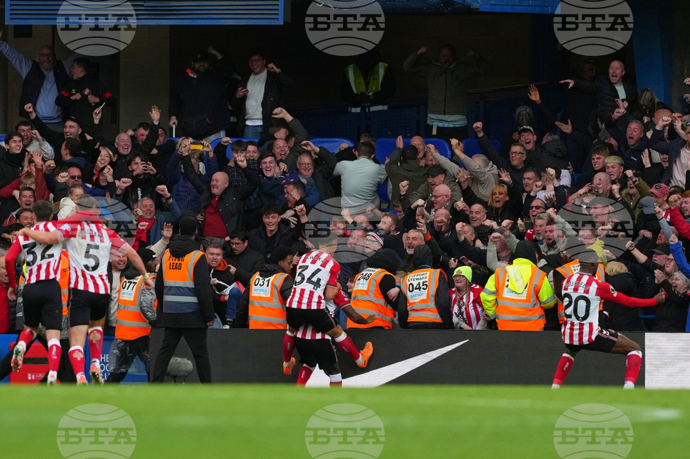 Brentford players celebrate after a goal during the Premier League soccer match between Brentford and Liverpool in London, Saturday, Oct. 25, 2025. (AP Photo/Dave Shopland)