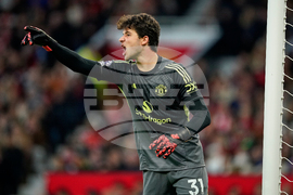 Manchester United's goalkeeper Senne Lammens shouts out during the English Premier League soccer match between Manchester United and Brighton & Hove Albion in Manchester, England, Saturday, Oct. 25, 2025. (AP Photo/Dave Thompson)