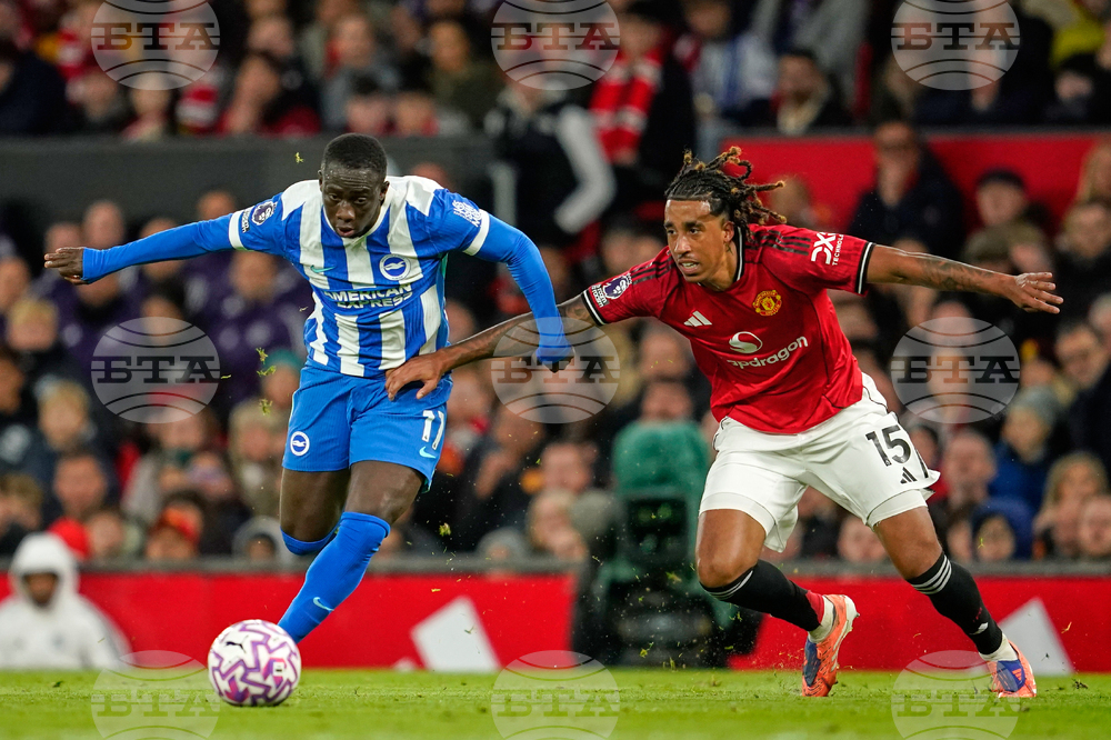 Brighton's Yankuba Minteh, right, is challenged by Manchester United's Benjamin Sesko during the English Premier League soccer match between Manchester United and Brighton & Hove Albion in Manchester, England, Saturday, Oct. 25, 2025. (AP Photo/Dave Thompson)