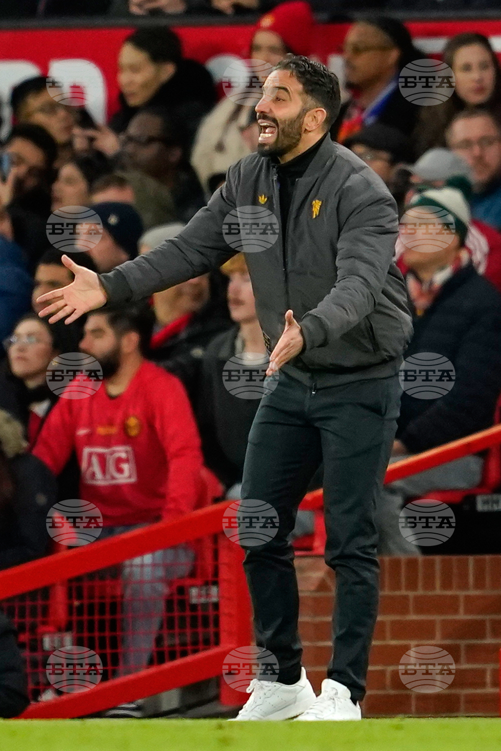 Manchester United's head coach Ruben Amorim shouts from the touchline during the English Premier League soccer match between Manchester United and Brighton & Hove Albion in Manchester, England, Saturday, Oct. 25, 2025. (AP Photo/Dave Thompson)