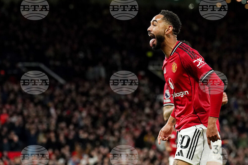Manchester United's Matheus Cunha celebrates scoring the opening goal during the English Premier League soccer match between Manchester United and Brighton & Hove Albion in Manchester, England, Saturday, Oct. 25, 2025. (Martin Rickett/PA via AP)
